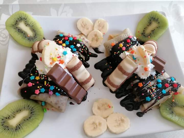 Faina, ou, lapte, sare, nutella, fructe decor.