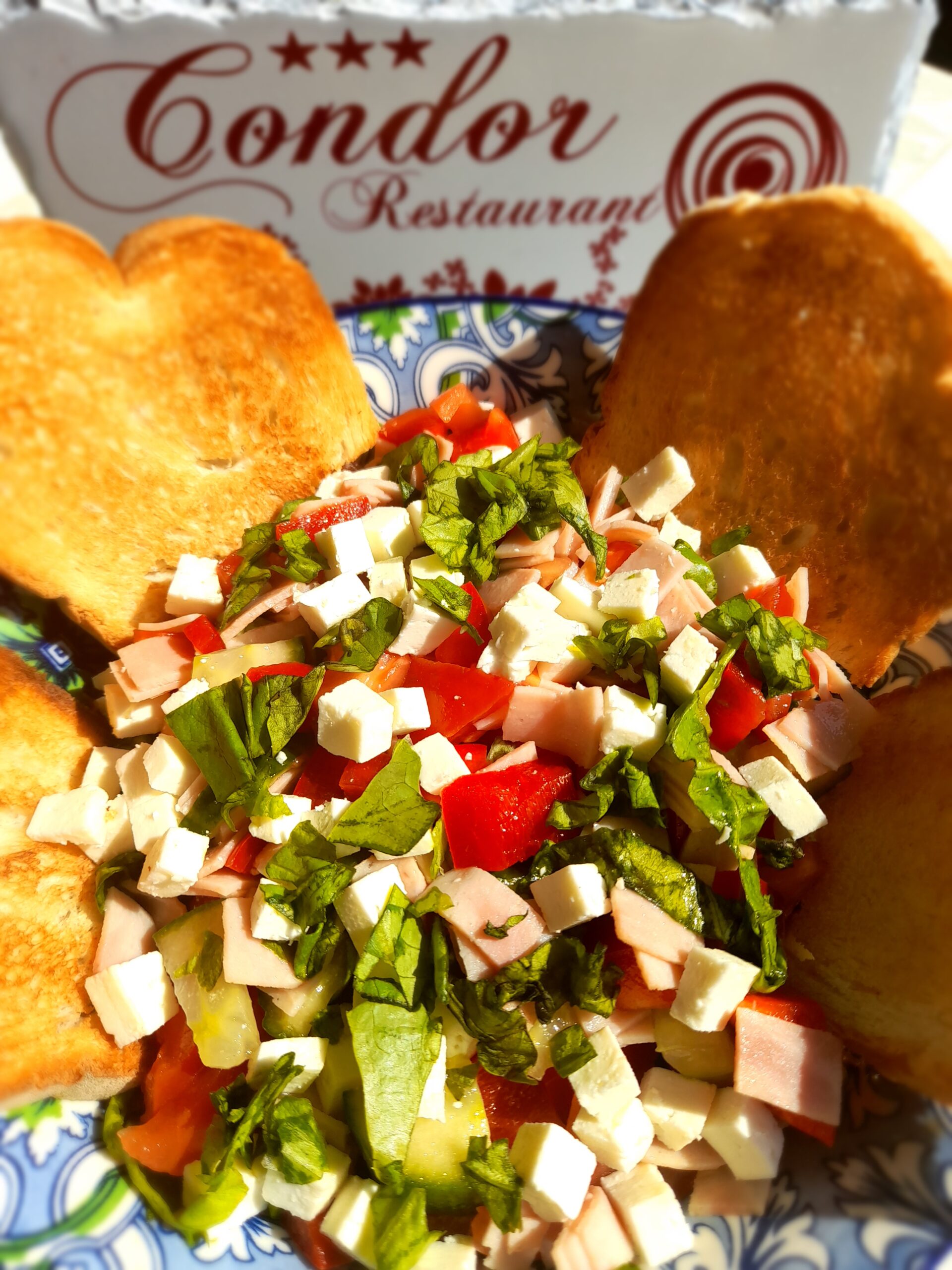 Ardei gras, castraveti, rosii, salata verde, sunca, telemea, paine prajita. 500 g