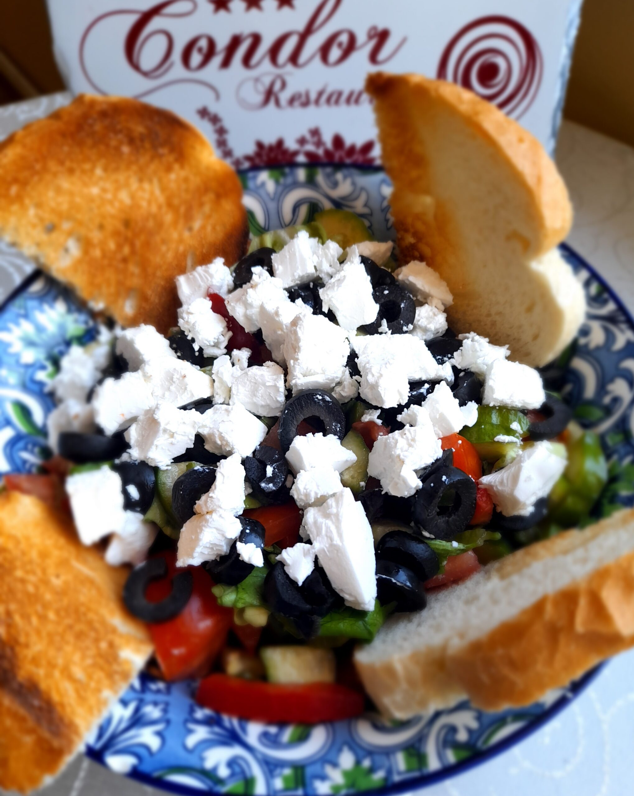 Ardei gras, branza feta, castraveti, masline, rosii, paine prajita. 500 g